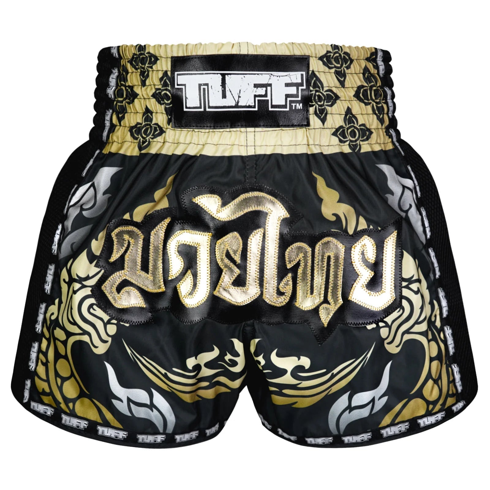 The black boxing shorts feature a golden Thai traditional pattern which is influenced by the graceful Hongsa and the guardian of the treasure, Naga.