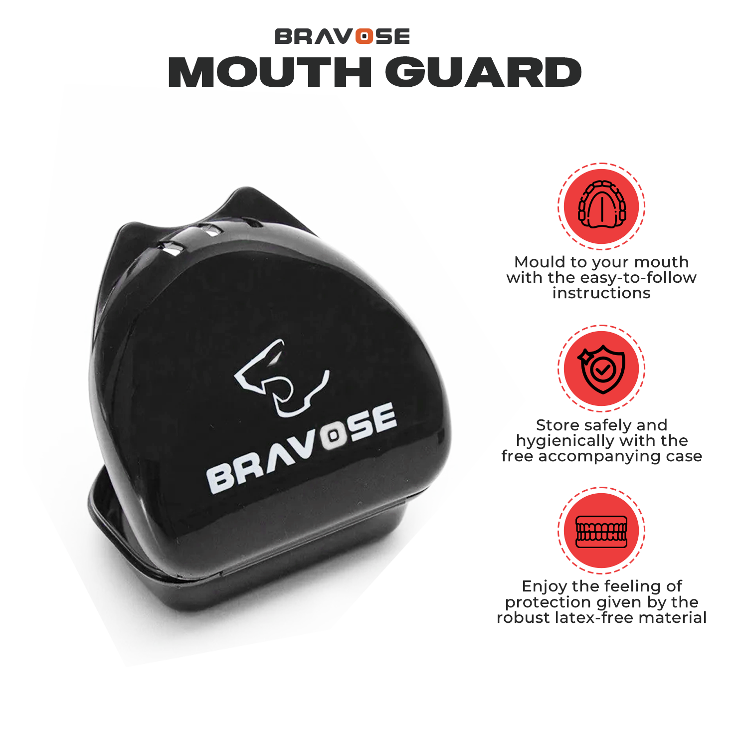 Make sure your fight has bite with the Bravose mouth guard. Enjoy the feeling of protection given by the robust latex-free material, and focus all your attention on your boxing. Providing optimal shock absorption and a personalised fit, each mouthguard comes with a free case so it can be safely and hygienically stored.